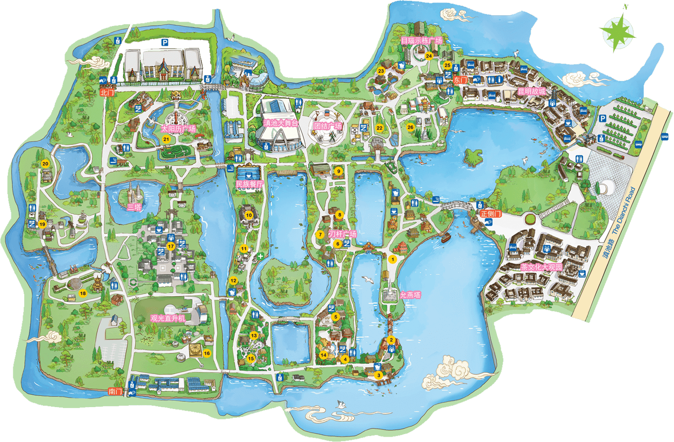 傣族人口約107萬(wàn)人,主要分布在云南的德宏傣族景頗族自治州、西雙版納傣族自治州及瀾滄江流域的河谷壩子區(qū)域。傣族寨是進(jìn)入民族村的第一個(gè)村寨,占地面積27畝,三面環(huán)水,綠樹掩映。一幢幢“干欄式”傣家竹樓,通過(guò)蜿延的紅砂石小徑聯(lián)向肅穆的緬寺。巍峨壯觀的白塔,精巧玲瓏的風(fēng)雨橋,以及風(fēng)雨亭、水井、鐘亭等建筑充滿著傣家的濃郁風(fēng)情,是傣寨真實(shí)的民間景觀再現(xiàn)。一年一度的“潑水節(jié)”期間,這里都有活潑歡快的“象腳鼓舞...